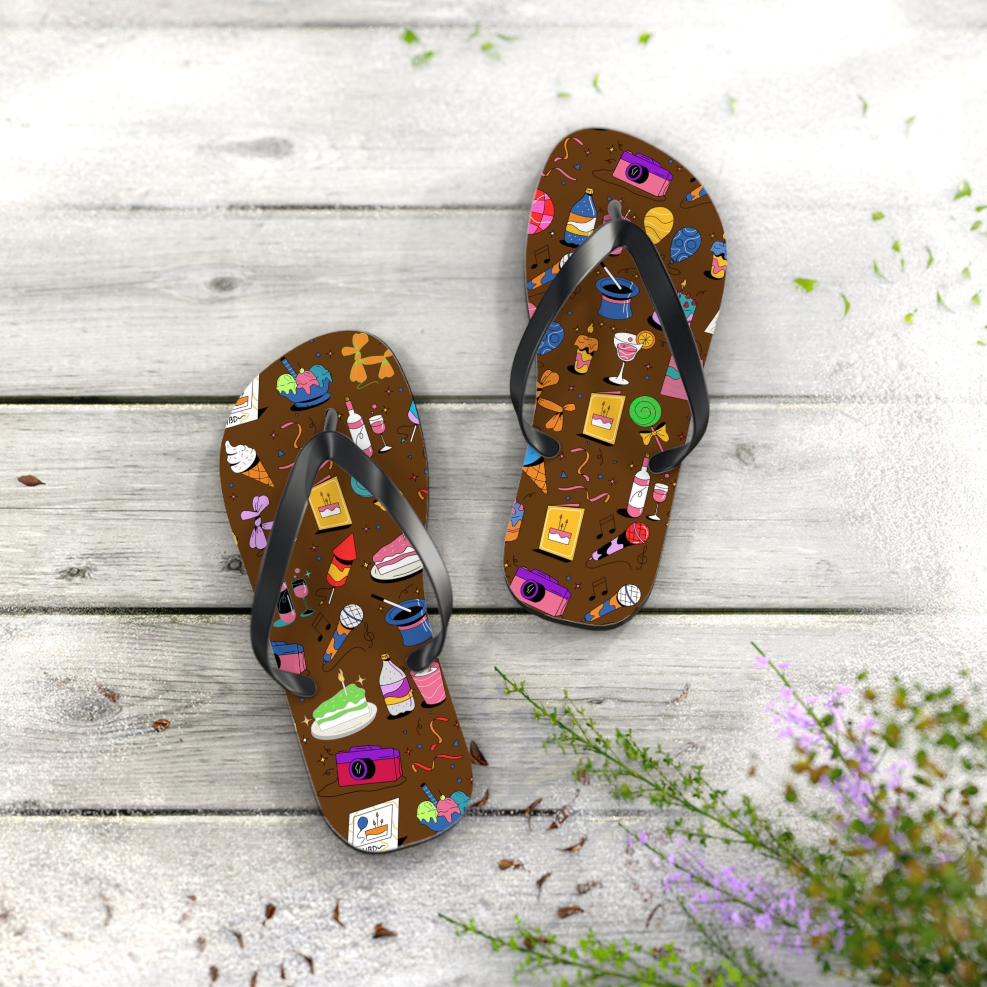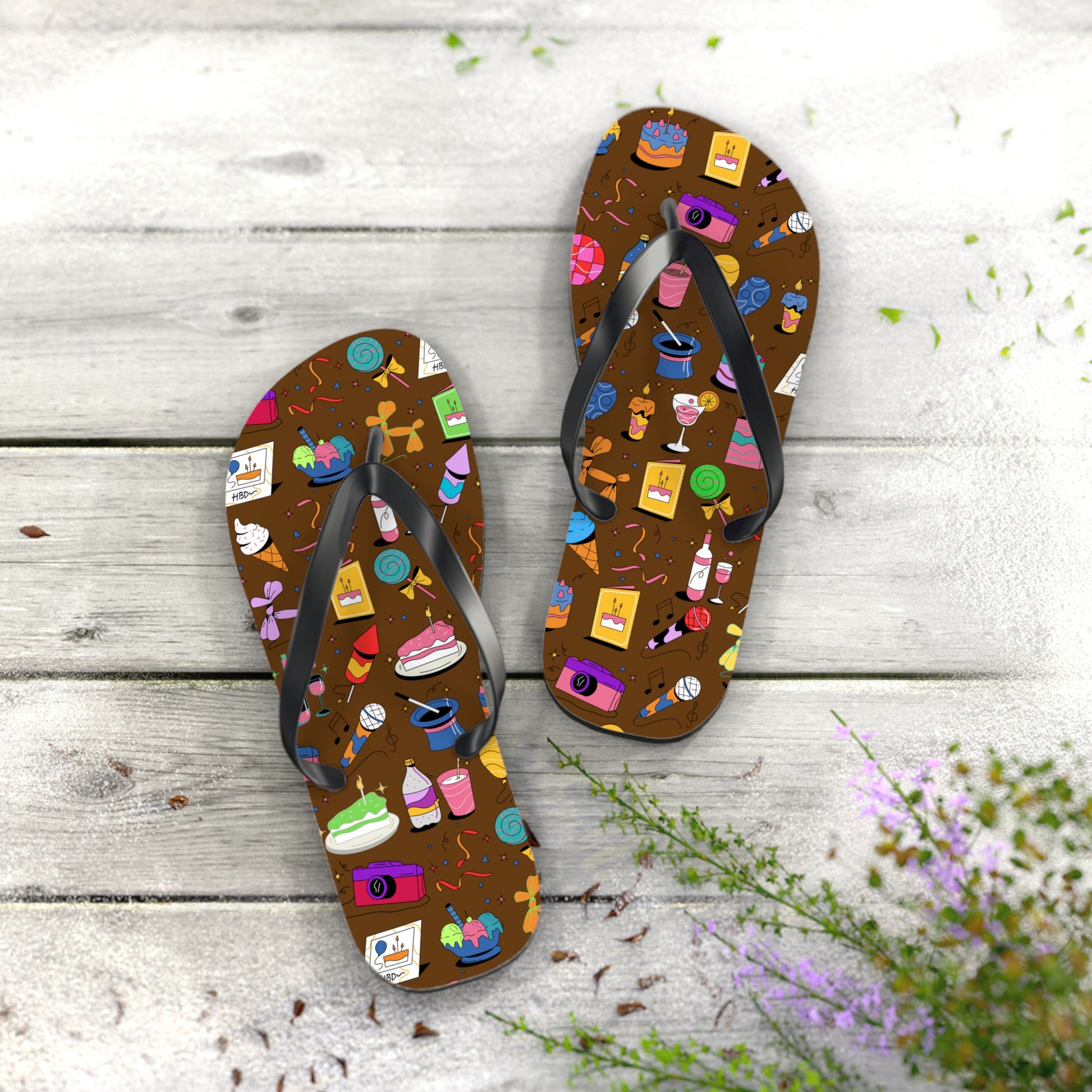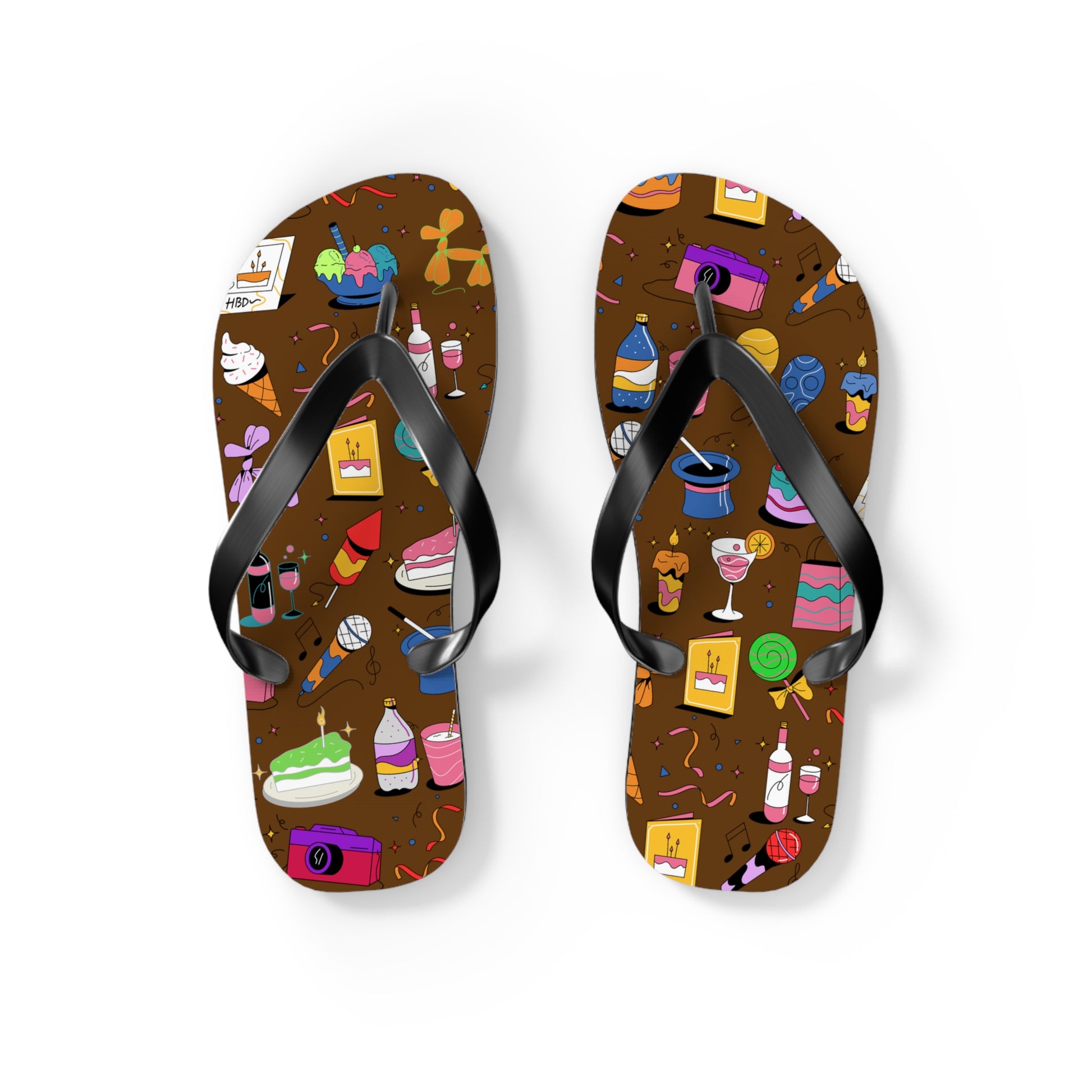 Bright, playful flip flops that bring a sprinkle of dessert-shop joy to warm-weather days. The cushioned polyester-suede footbed showcases a lively pattern of cakes, cupcakes, candy, and little pops of celebration against a rich chocolate background. Lightweight EVA soles and textured slip-resistant bottoms keep your steps confident on pool decks, boardwalks, or kitchen tile. The classic black PVC straps sit comfortably between the toes and let the colorful print take center stage—wear them for casual strolls, summer parties, or relaxed mornings when you want something cheerful underfoot.